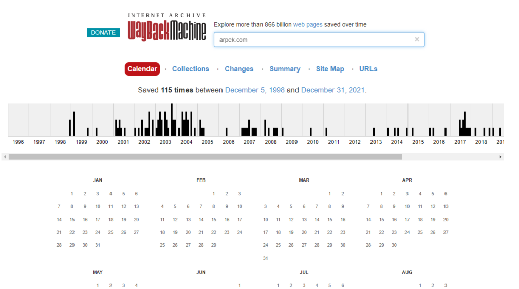 Lo primero que hice en el momento de conocerla fue ir a la «máquina del tiempo» (WayBack Machine) e ir a buscar los orígenes de mis primeras páginas creadas a mediados de los 90 y ver que algunas informaciones aún eran disponibles. As es como se inicia una búsqueda y un ejemplo de la info disponible para mi primera página web por mi creada y posteada: arpek.com
